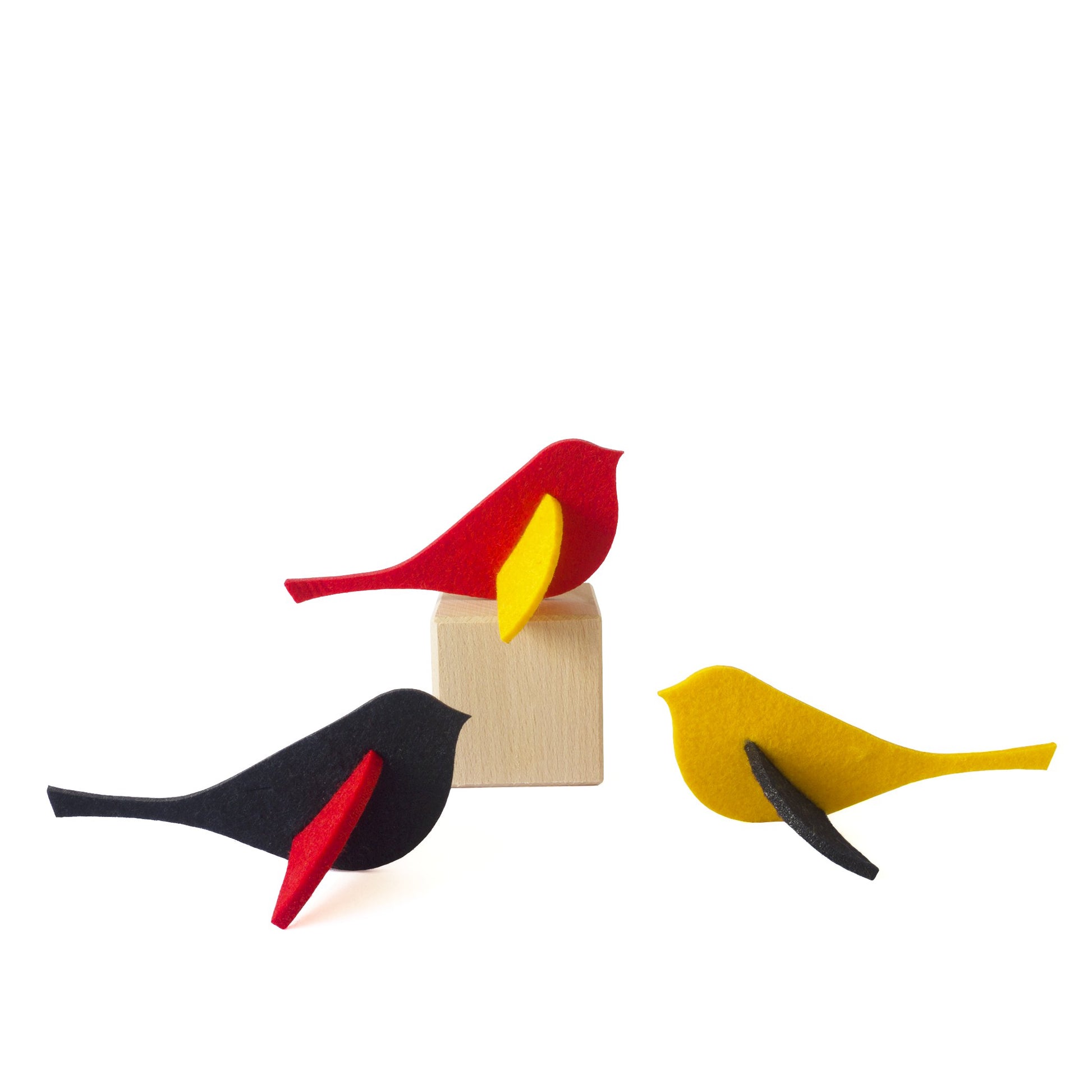Μπομπονιέρα πουλάκι από τσόχα σε κόκκινο, κίτρινο ακι μπλε χρώμα